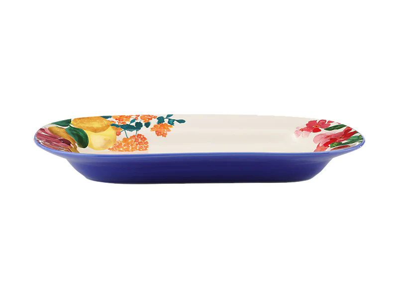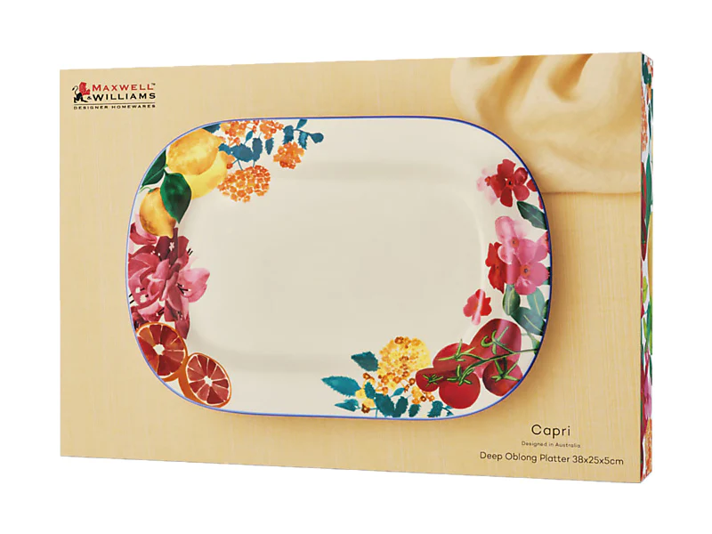 This deep oblong platter from the Capri collection brings the colours of the Mediterranean to your table. designed in Australia exclusively by Maxwell & Williams, this gorgeous platter features a design of fruits and flowers inspired by the Amalfi Coast. With a vibrant palette and deep oblong shape, it makes a dramatic statement piece for summer entertaining β the perfect choice for shared dishes and salads. Made from quality stoneware, itβs a practical and beautiful gift idea for any host.
